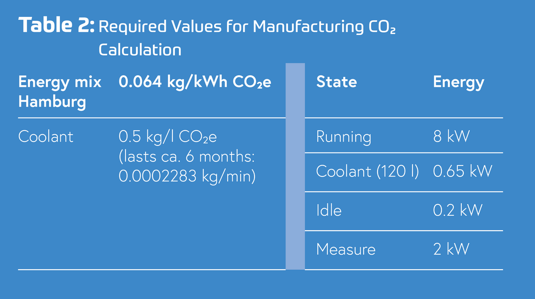 Once the raw material arrives at the workshop, the second step focuses on the manufacturing of parts. This involves calculating the emissions associated with setting up and operating machinery, such as milling machines. Each phase – initial setup, setup changes, and part removal – should be considered, along with the actual machining operations like milling or drilling. For each step, it is necessary to detail the time required, the resources consumed, and any additional factors, such as the use of coolants. The energy consumption for each machine state must be identified, along with the local energy mix and the CO₂ value of additional materials like coolants (see Table 2). The CO₂e for energy consumption is calculated using the formula: