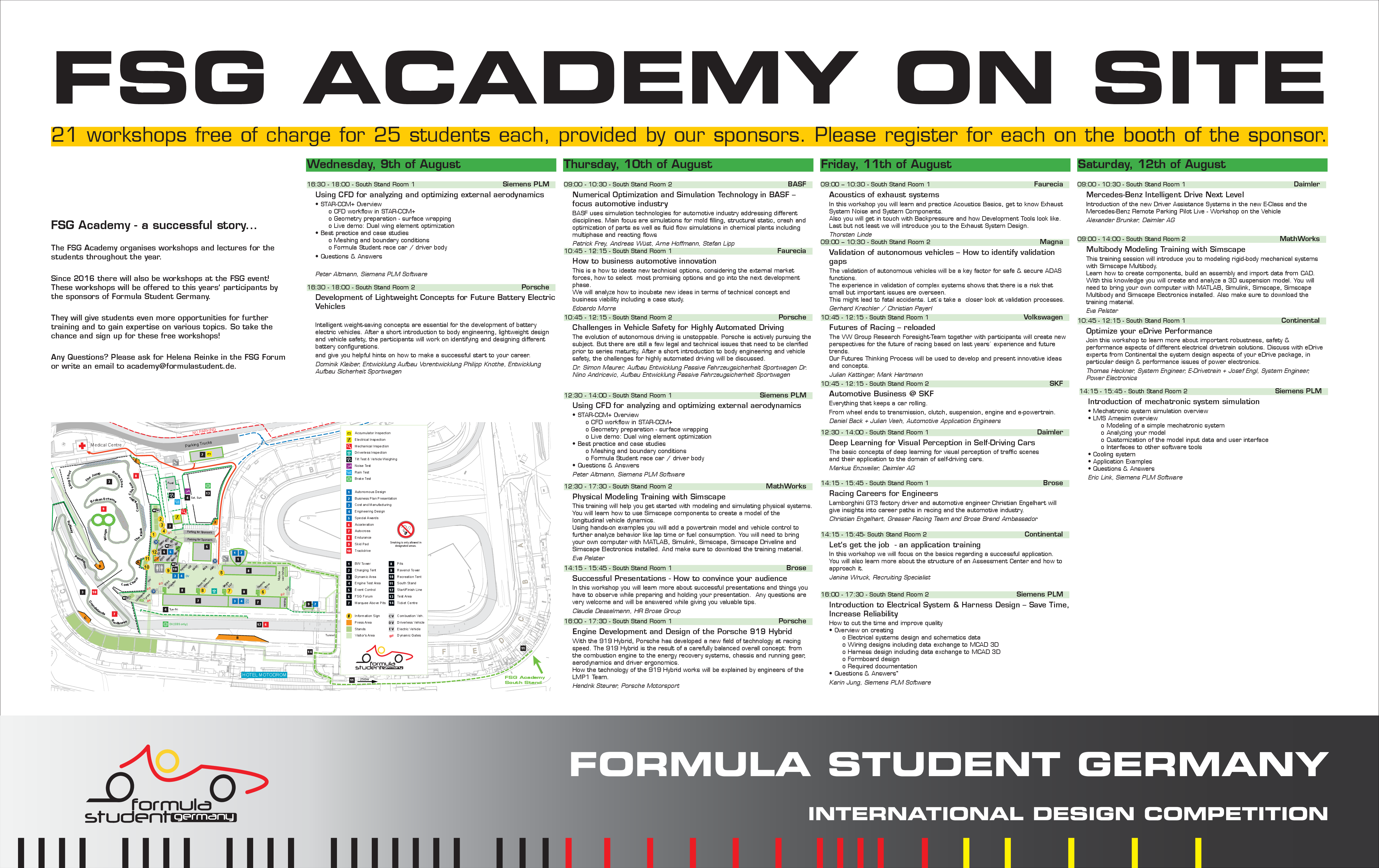 These workshops will be offered to this years' participants by the sponsors of Formula Student Germany. They will give students even more opportunities for further training and to gain expertise on various topics.
