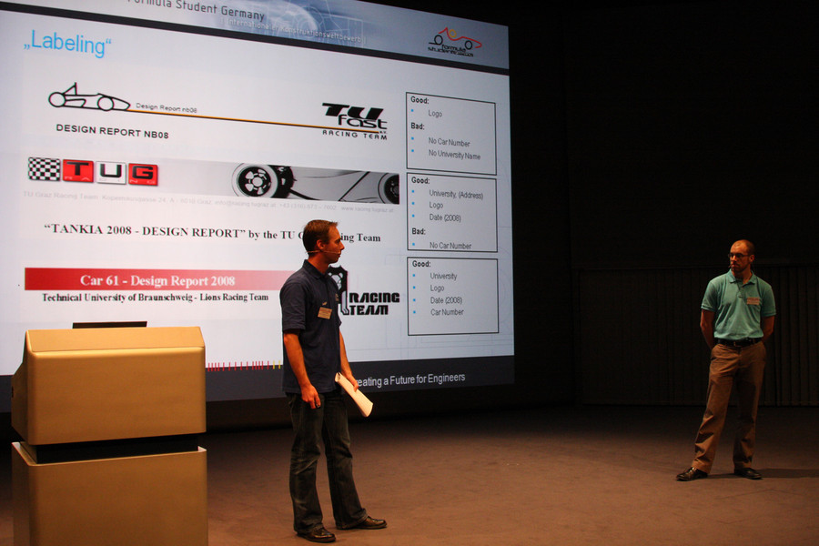 The workshop was an ideal add-on for active FS-teams with project and competition relevant information. And as usual the workshop also was a platform for the participants to get into contact with other teams and profit from their knowledge. The University of Stuttgart displayed its current car during the whole day as a good example of FS-engineering. The FSG 2008 winner Technical University of Delft reported about its formula for success.