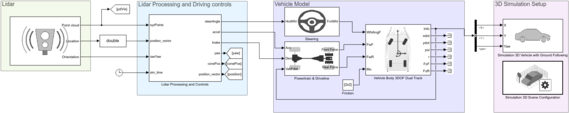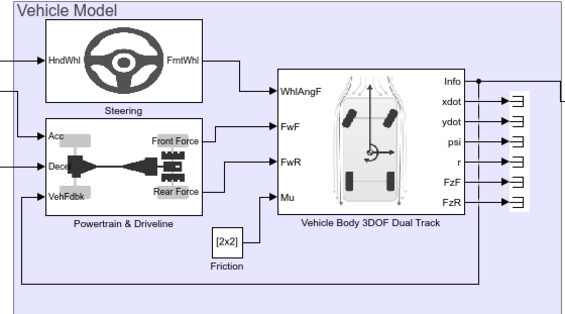 Vehicle dynamics: The vehicle dynamics model (Figure 7) consists of a vehicle body, simplified powertrain, driveline, longitudinal wheel, and kinematic steering. The purpose of the model is to calculate the position and orientation of the vehicle based on the steering, acceleration, and deceleration commands. To learn how to simulate longitudinal and lateral vehicle dynamics, refer to this video. The Simulation 3D Vehicle with Ground Following block and the Simulation 3D Scene Configuration block is used for setting up the 3D simulation environment in the Unreal Engine.