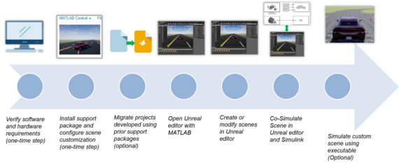 As the current problem requires a customized scene, we used the Unreal Editor and the Vehicle Dynamics Blockset Interface for Unreal Engine 4 Projects support package to build the scene. To learn how to customize scenes (Figure 2), please follow the steps explained in the documentation.