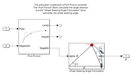 Lateral controller: Pure pursuit controller has been used for lateral control of the vehicle. To implement the controller in Simulink we have used a Pure Pursuit block to measure the target direction. Further, the target direction is converted into the required steering angle using wheel steering angle formulation. To learn more about vehicle path tracking using a pure pursuit controller, please refer to this video.
