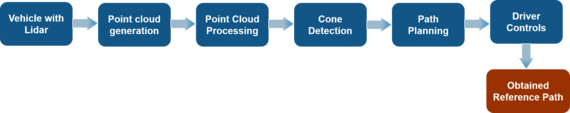 This is done by finding the two closest cones and calculating the midpoint of those cones. The algorithm generates acceleration, steering commands towards this midpoint. The algorithm also limits the maximum speed of the vehicle to a pre-set threshold.
