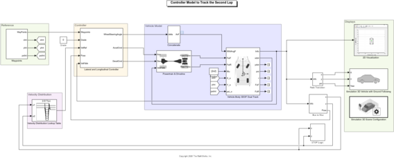 In the second lap, the vehicle tracks a reference path obtained from the first lap simulation. Figure 8 shows the Simulink model. Compared to the last model, in this model, we have removed the lidar block and have added the longitudinal and lateral controllers.