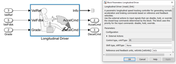 Longitudinal controller: The Longitudinal Driver block is used to regulate the speed of the vehicle. Specifically, it is a PI controller that generates the actuator signal for the reference speed.