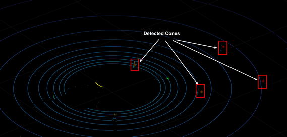 Cone detection: The goal of the cone detection algorithm is to cluster all points that belong to one cone and identify the position of the cones. This is done by calculating the distance between consecutive points in the point cloud. The points that belong to the same cone are close to each other, while cones are relatively far apart from each other. After clustering, the midpoint of the cone is the mean of the position of all the points in the cone.