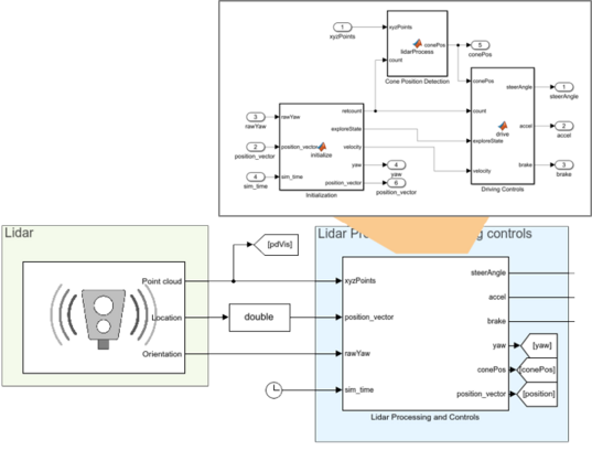 Lidar mounting: The purpose of the lidar is to measure the distance to the cones. The Simulation 3D Lidar block provides an interface to the lidar sensor in a 3D simulation environment. The environment is rendered using the Unreal Engine from Epic Games. The block returns a point cloud with the specified field of view and angular resolution.