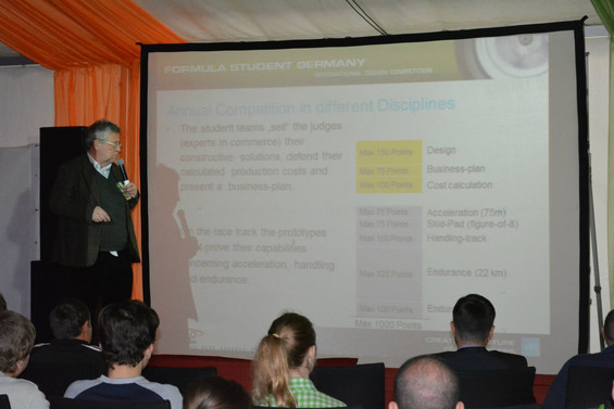 For that reason, longterm FSG judge and FS backbone Pat gave some insights into Formula Student as an educational competition and a technical presentation to the students on how a formula student racecar is designed and built. He is now named Chief Design Judge and Technical Advisor to the FSR event 2014.