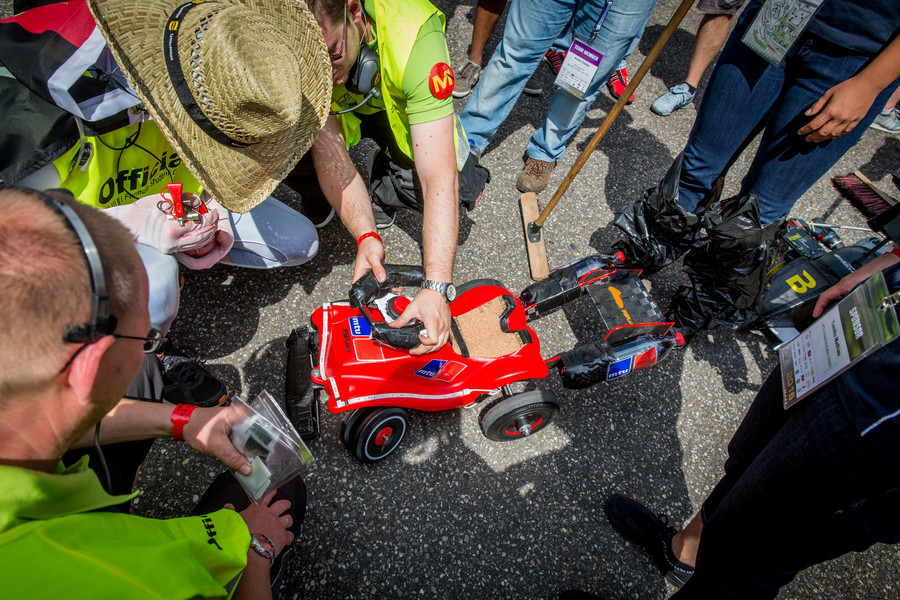 The sponsors had only four days to conceptualize, build and test an individual and innovative transportation system from an identical basic vehicle (Bobby Car). Todays acceleration put their technical solution to the test. After a driver briefing and thorough tech inspection, all cars lined up on the start-finish line to race.