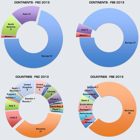 Including the teams on the waiting lists 5 continents are represented. The successfully registered teams are spread over 24 countries and 4 continents. To get a better impression of where the teams come from that registered for FSG 2013 here are a few diagrams.
