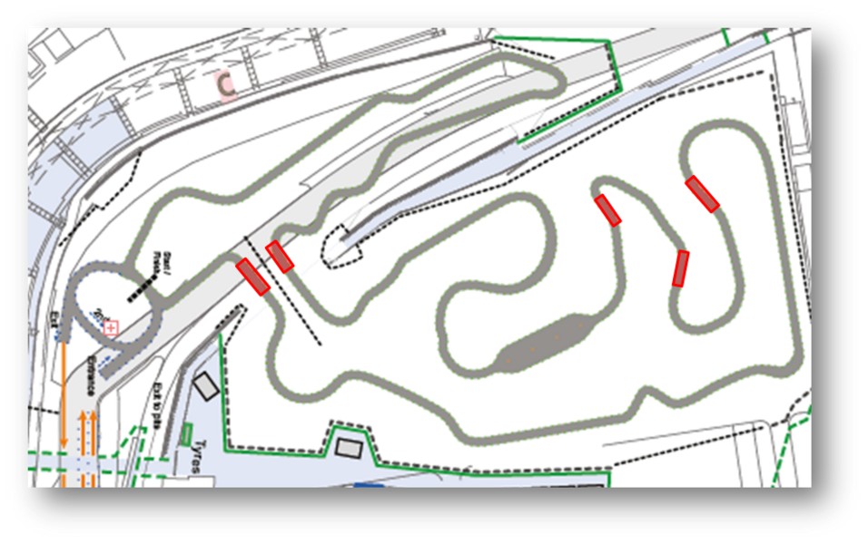 According to rule T6.2 in only five areas it is allowed to touch the ground on the track with the car. You can find these special zones marked in red on the attached picture. Touching the ground outside of these areas will lead to a DNF for the run.