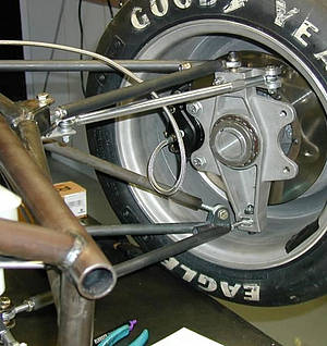 The outer spherical bearings are threaded rod ends loaded in bending! The entire mass of the car, plus bump loads, weight transfer and brake torque are reacted to the chassis by bending the threaded shank of the lower joint. This is going to break! GTB! Do not do this!