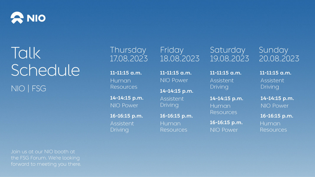 Our partner NIO will host several talks from Thursday to Sunday about NIO Power, Assisted Driving and the possibilities to Join the NIO Team.