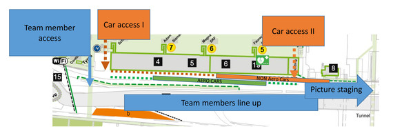 - Cars: Cars are to be brought into the pit lane (track side) through the access gate close to the tire service and through the pits close to the welding service. From entrance of the pit lane only the car (with seated driver) and one team member to push the car with pushbar is allowed.