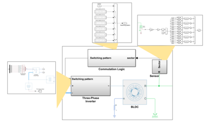 To control the motor at different speeds, first, we sense the angular position using an Ideal Rotational Motion Sensor↗ block. Further, the angular position information is used by the hall sensor to determine when the rotor transitions from one sector to another. Next, we have built a commutation logic to compute the switching pattern for the three-phase inverter.