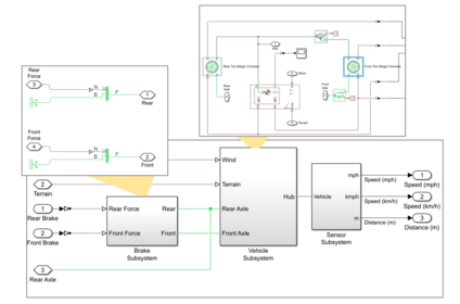 - Brake: The brake is applied at the rear and front wheels. It has been modeled using the Loaded-Contact Rotational Friction↗ block that transmits torque between two rotating surfaces.