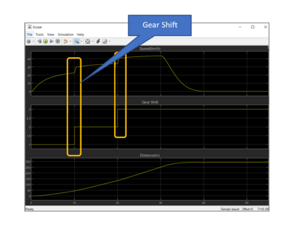 Once we run the simulation, it is evident that the controller can reach the reference velocity of 40 km/h and drops down to zero after ~30 seconds. The sudden change in the vehicle speed accounts for the gear shift.